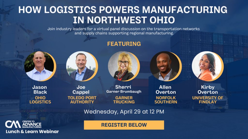 Join the Center to Advance Manufacturing for a virtual panel discussion featuring regional leaders from trucking, rail, ports, and higher education as they explore how logistics systems support manufacturers across Northwest Ohio. Panelists will share perspectives on transportation strategy, supply chain resilience, workforce needs, and emerging trends shaping the future of manufacturing and logistics.